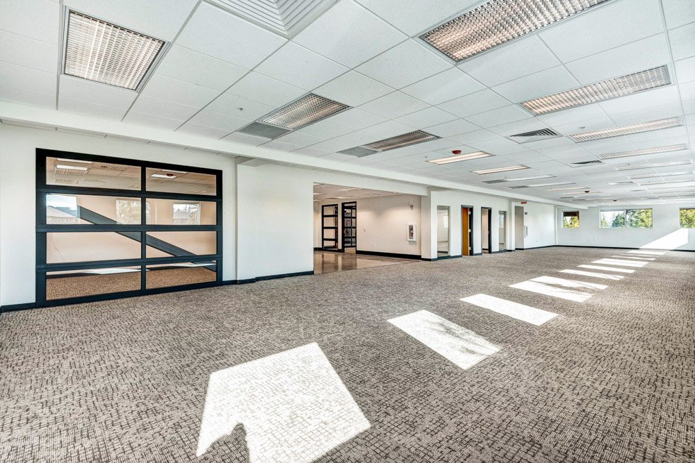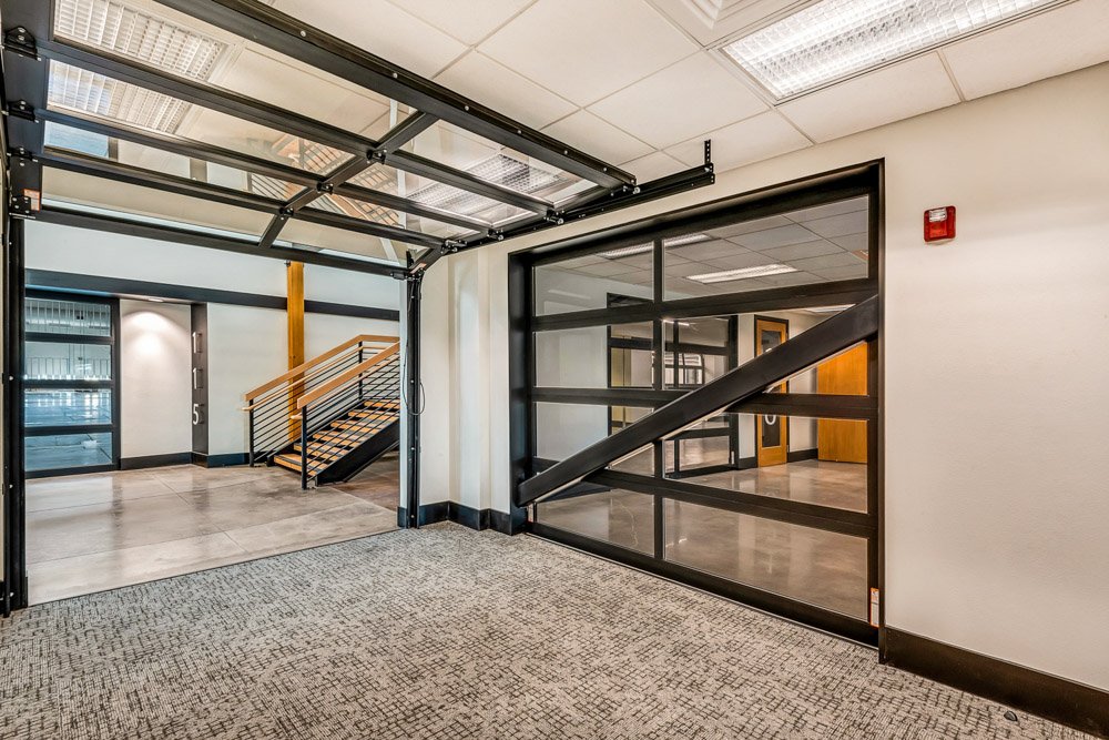 In addition, we installed seven operable doors where these individual office units opened into common areas. Our technicians mounted powder-coated track and hardware above a drop ceiling and added springs lines for a subtle finish. All of which contributed to the building’s overall sleek and modern appearance.
